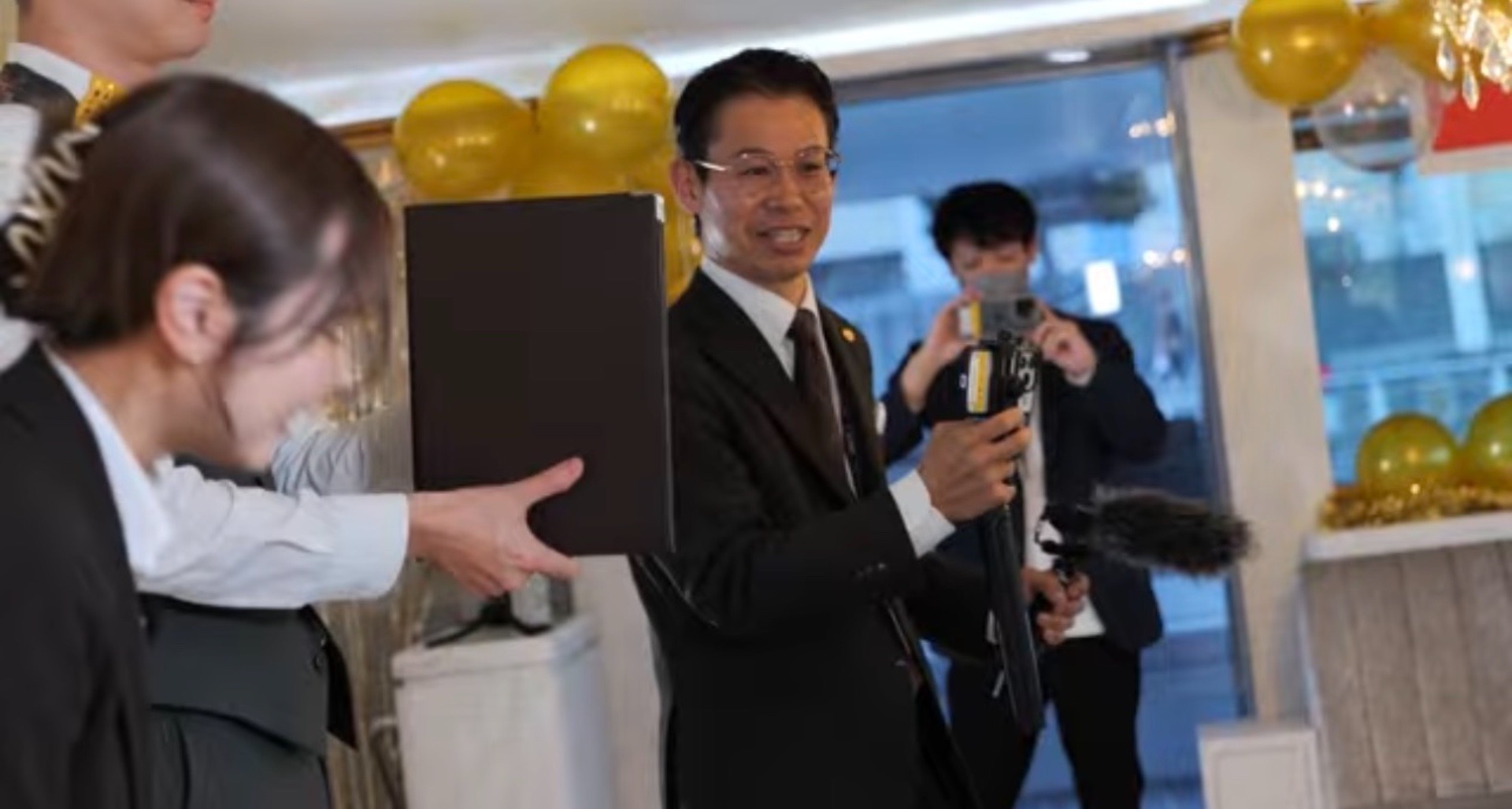 会長専属カメラマン 小玉氏 社員は彼の行動に困惑しています。会長の犬
